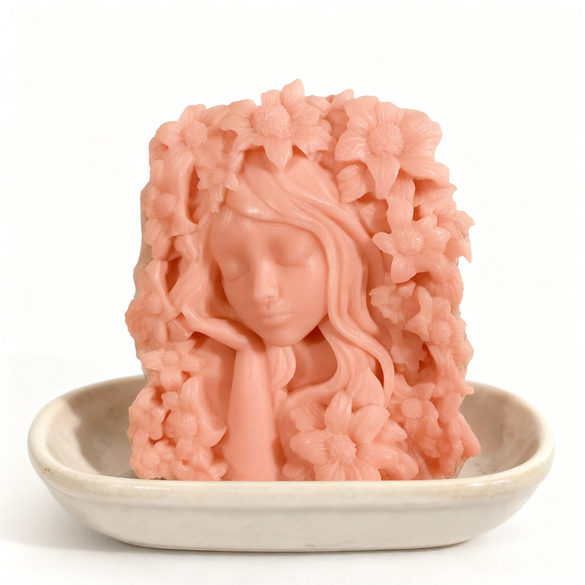 Each bar features a serene feminine figure nestled in a cascade of carved blossoms, making it as much a keepsake as a cleansing ritual. Gentle on skin, rich in lather, and steeped in story.